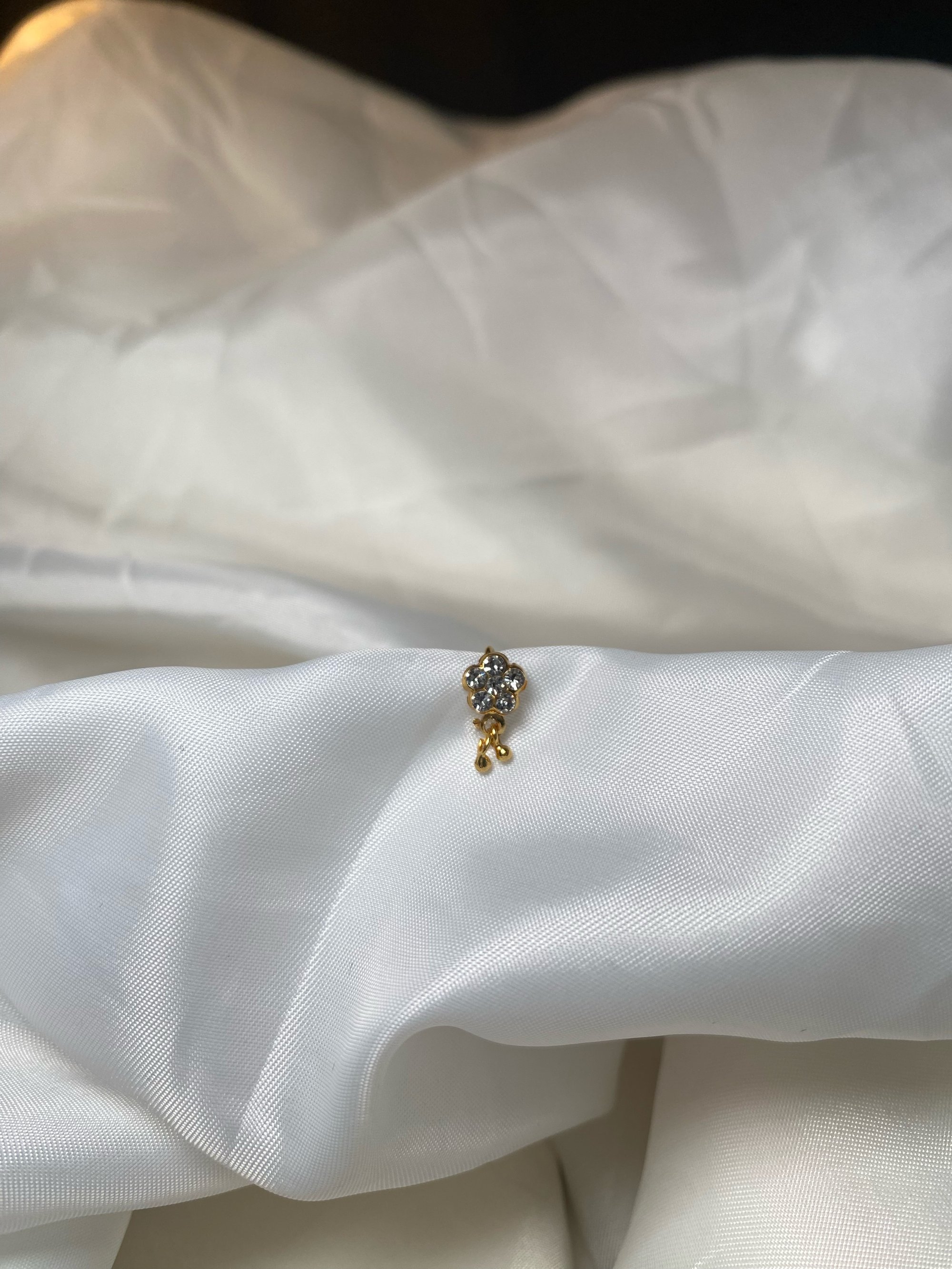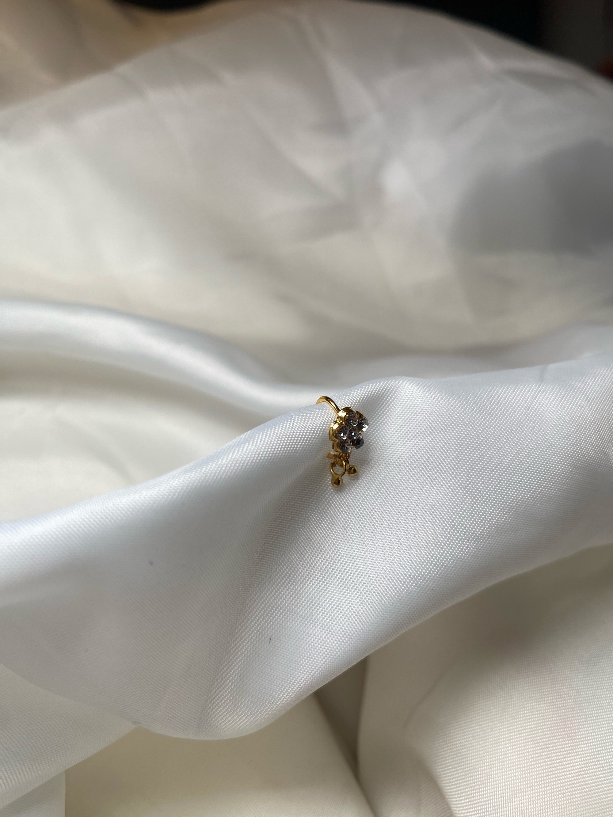 Introducing our captivating Dangling Hoop Nose Ring, featuring a charming flower shape adorned with dazzling diamonds set in radiant gold. With adjustable ends for comfort, this high-quality piece is meticulously crafted at 20 gauge from durable brass. Elevate your elegance effortlessly with this stunning accessory, promising to make you feel absolutely gorgeous and elegant.