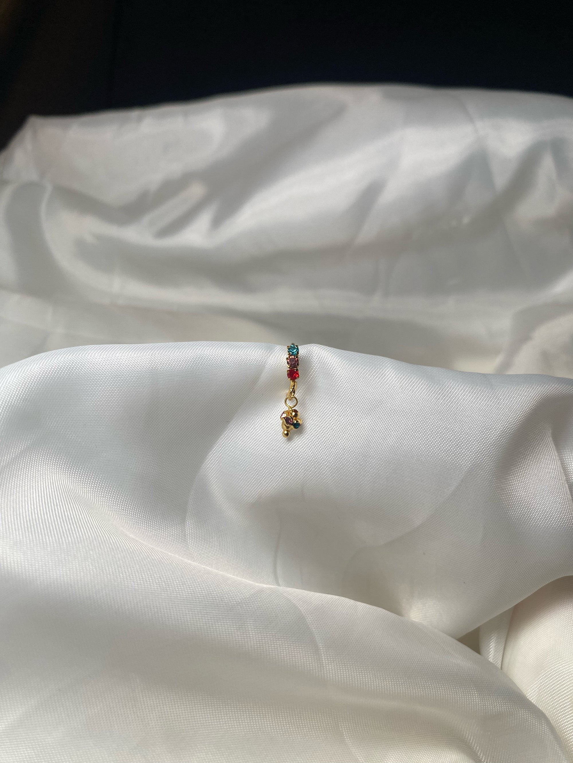 Step into elegance with our Dangling Hoop Nose Ring, a stunning accessory crafted in gold with diamonds and vibrant colors. Featuring adjustable ends for a perfect fit, this high-quality piece is both durable and delicate at 20 gauge, made of brass. Elevate your style effortlessly with this exquisite nose ring, radiating sophistication and charm with every wear.